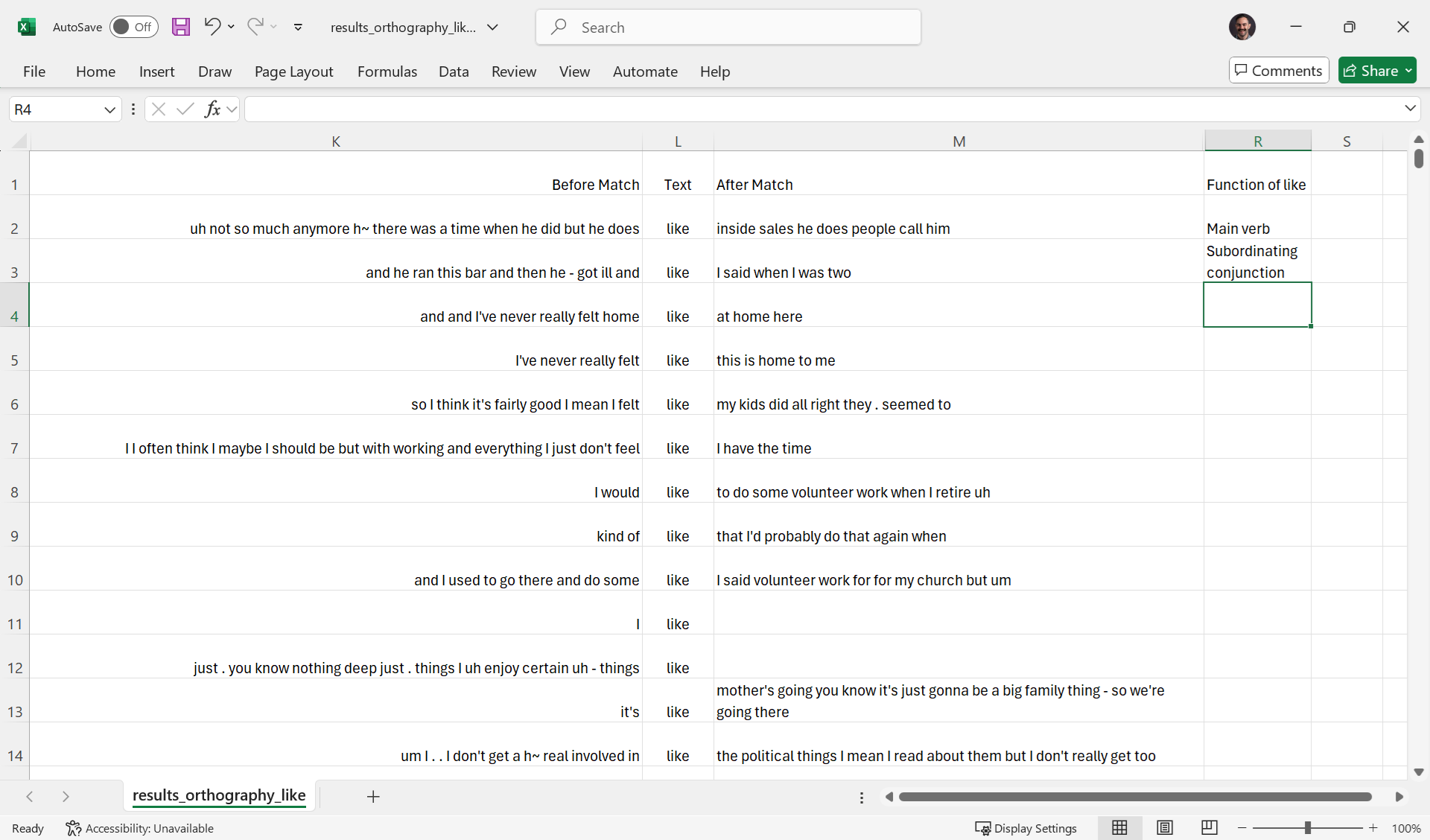 Since the Before Match, Text, and After Match columns show the same search context thatâs on the Search results page, you can use only the CSV file if you donât want to use multiple windows. This can be useful if you have a lot of tokens to code and canât count on internet access the whole time. That said, it does take some tweaking of the display settings to look nice. Hereâs what it looks like in Excel when you hide all columns except those three and the coding column, adjust the column widths, select Wrap text so the whole context is visible when itâs long, and adjust row heights so theyâre not too tall: