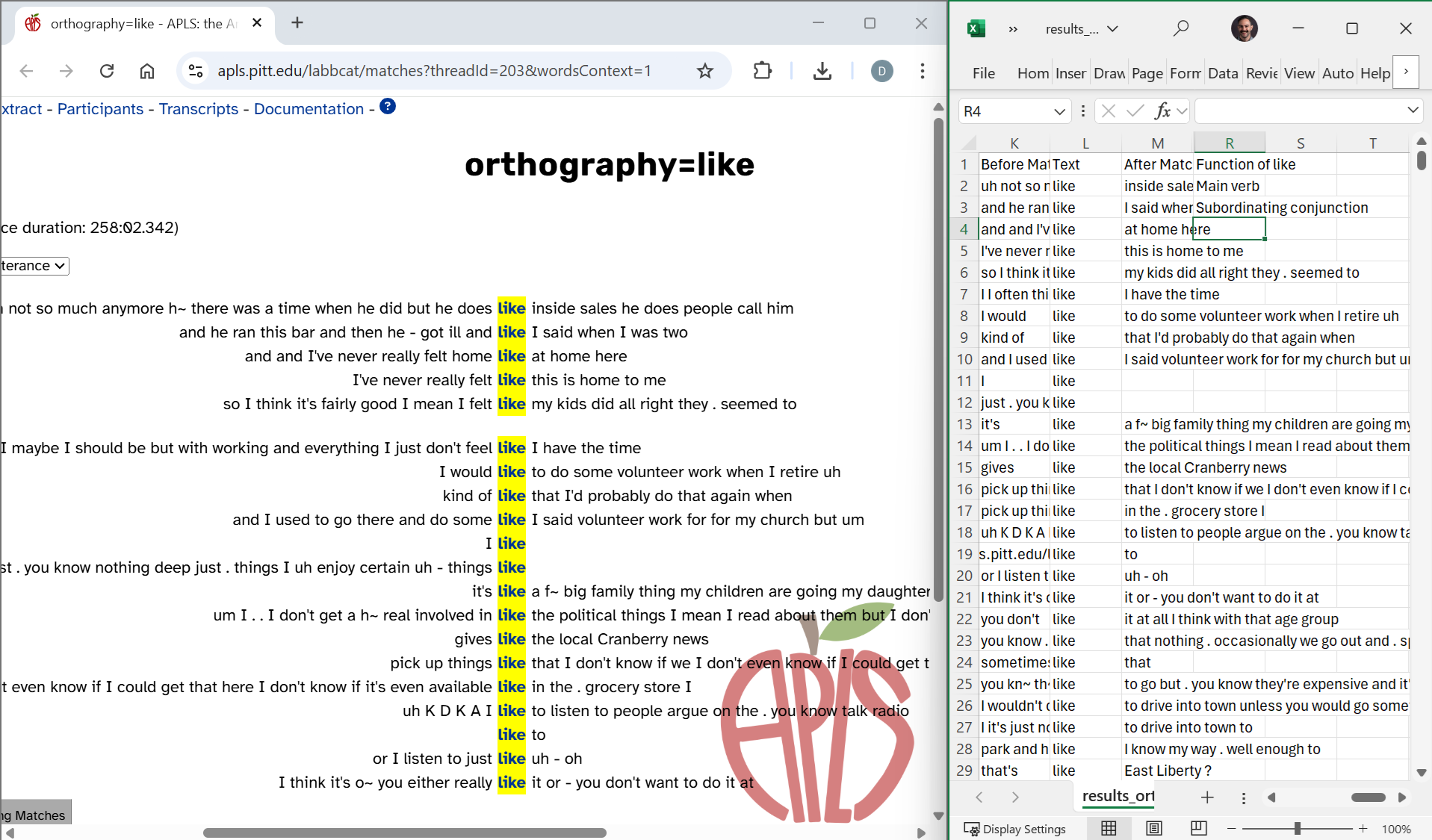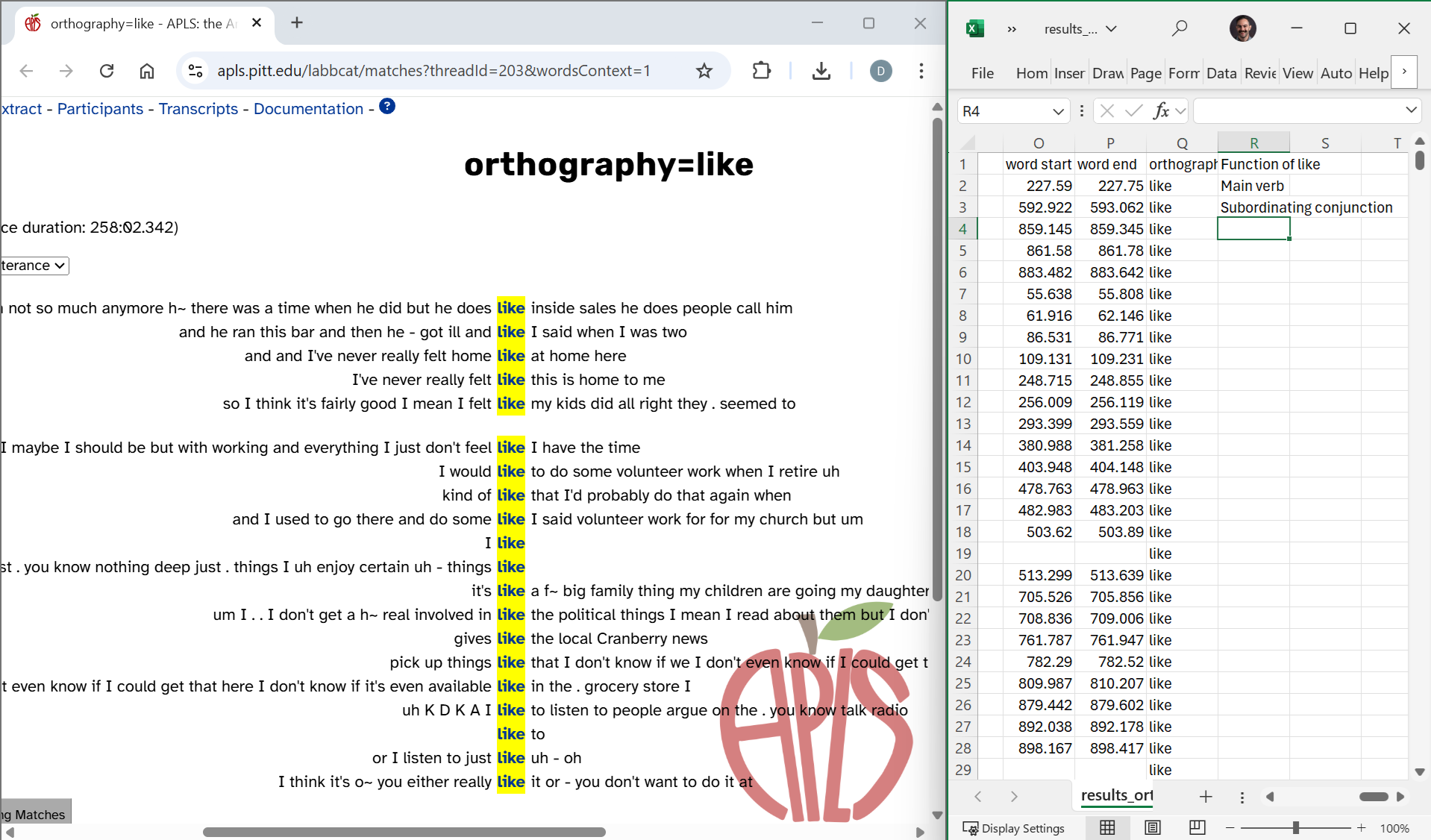 In this scenario, annotations that are already in APLS provide the codes. This works well for many lexical variables (like slippy vs. slippery), morphological variables (like donât vs. doesnât), and syntactic variables (like will vs. going to vs. gonna). In each of those cases, you can export annotations on the orthography layer.