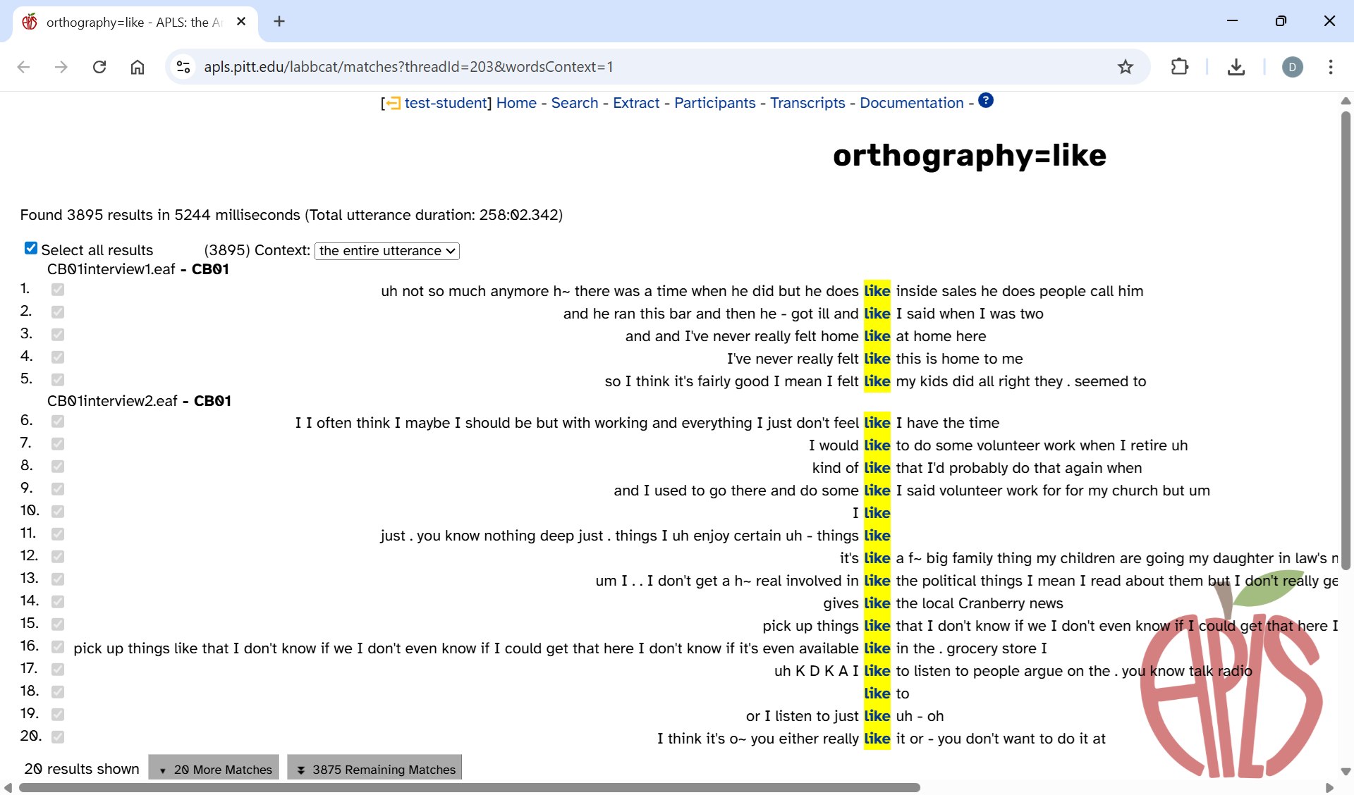 If you want to return to the Search results page interface after youâve closed APLS, you can reupload your CSV file to the Extract data based on search results page (https://apls.pitt.edu/labbcat/matches/upload).