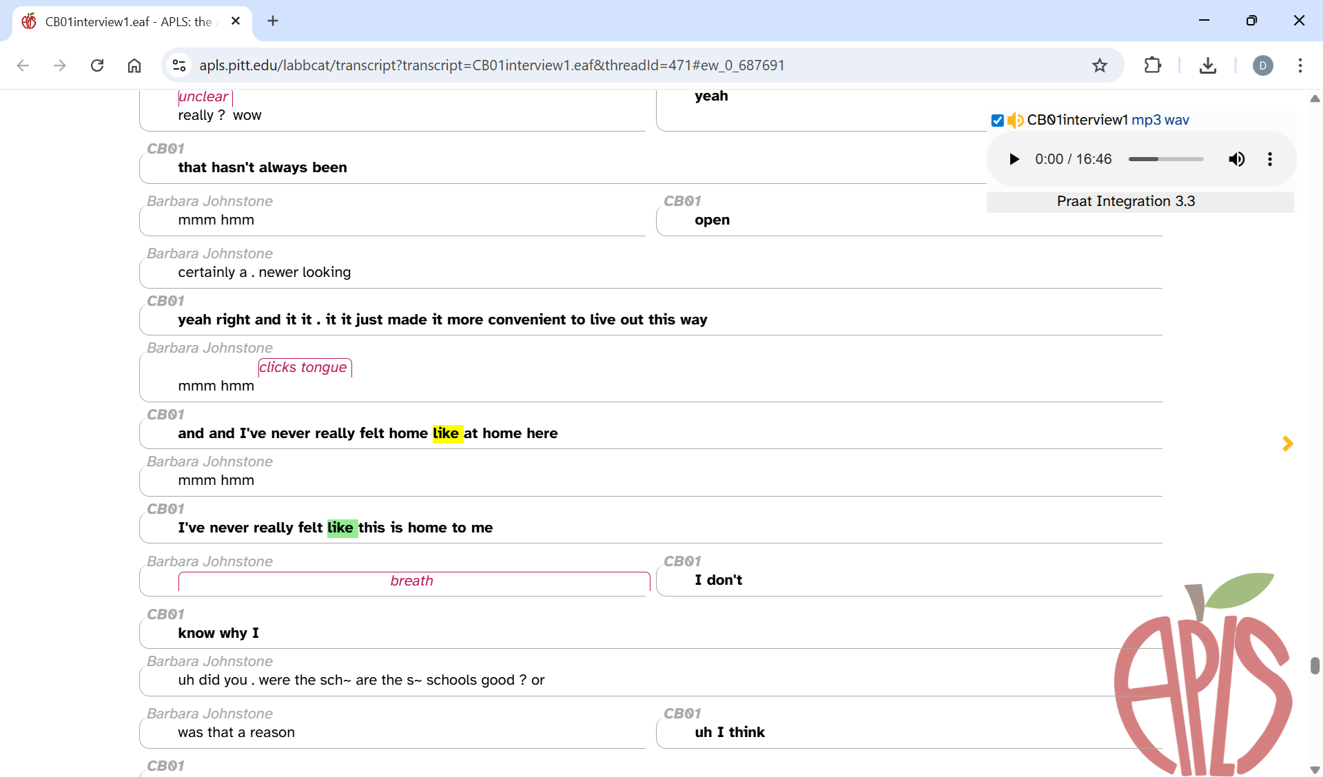 One way to do auditory coding in APLS would be to open each search result on the Transcript page and use the word menu to play just the utterance that contains the token. But weâve created a faster way: CodeTokens.praat. CodeTokens.praat is a program (running within Praat) that makes coding faster and easier by seamlessly integrating with the APLS Search results page, playing tokens one-at-a-time, providing a graphical user interface for selecting variants, and writing your codes to a CSV file:
