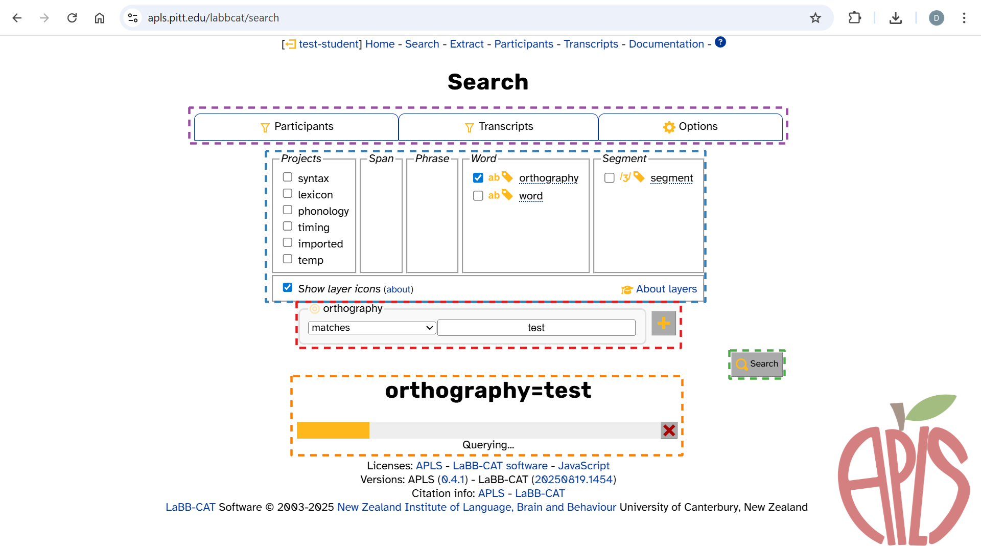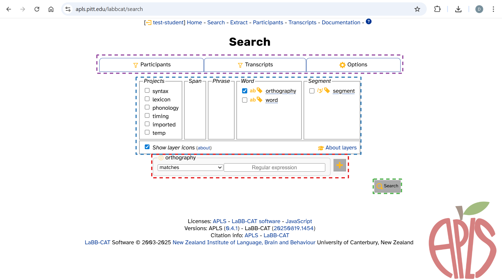 APLS provides powerful search capabilities for finding linguistic patterns1 in the interview data. It all starts from the Search page: https://apls.pitt.edu/labbcat/search. Once you create a search, you can export the results in a variety of formats.