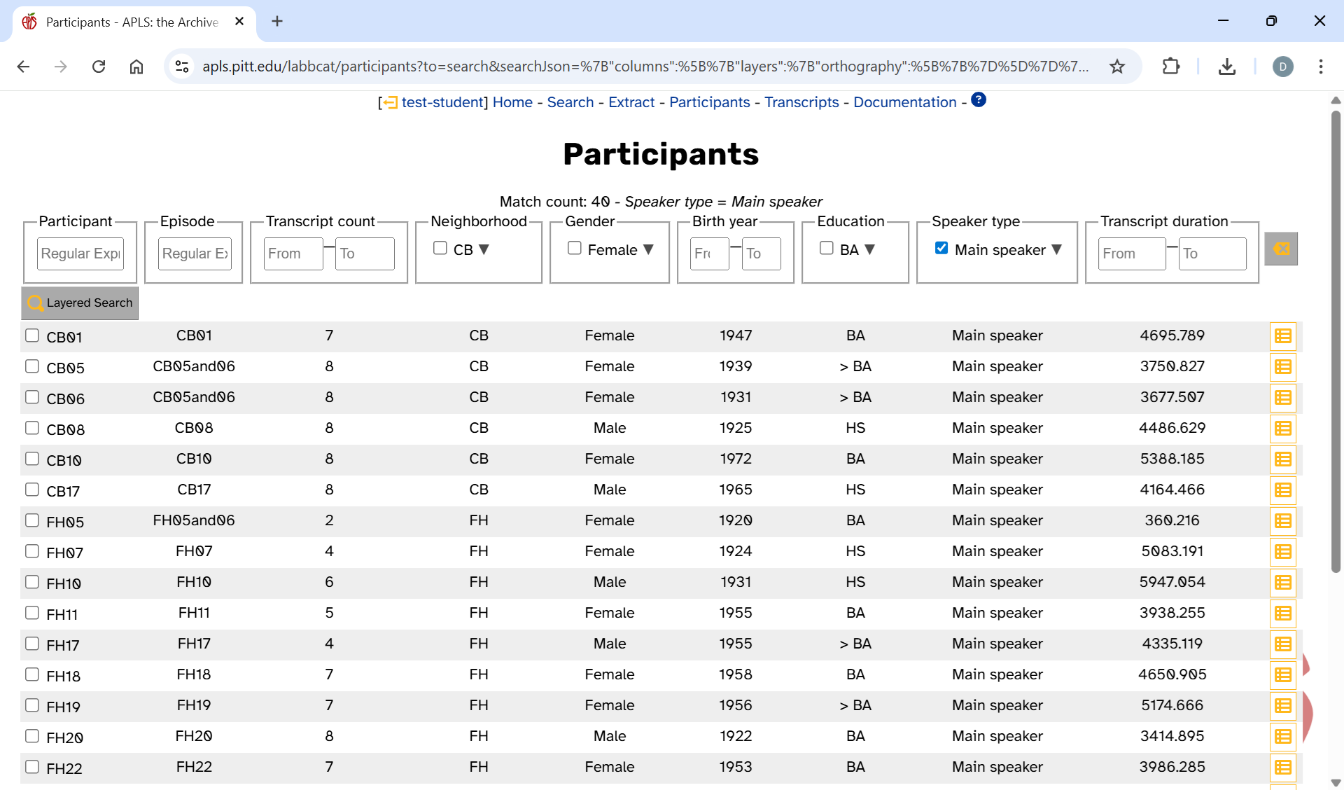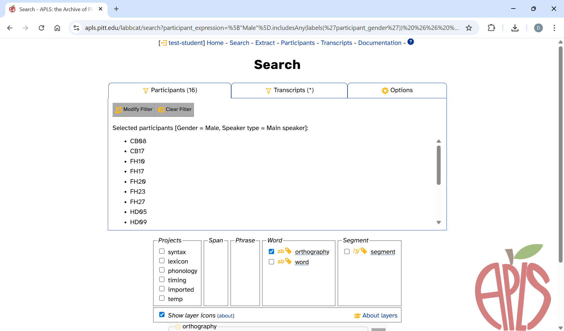 You can specify both a participant filter and a transcript filter at the same time. This is useful if, for example, you only want to search minimal pairs tasks from male participants who are main speakers.