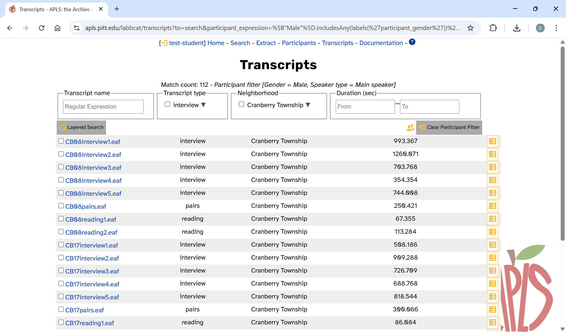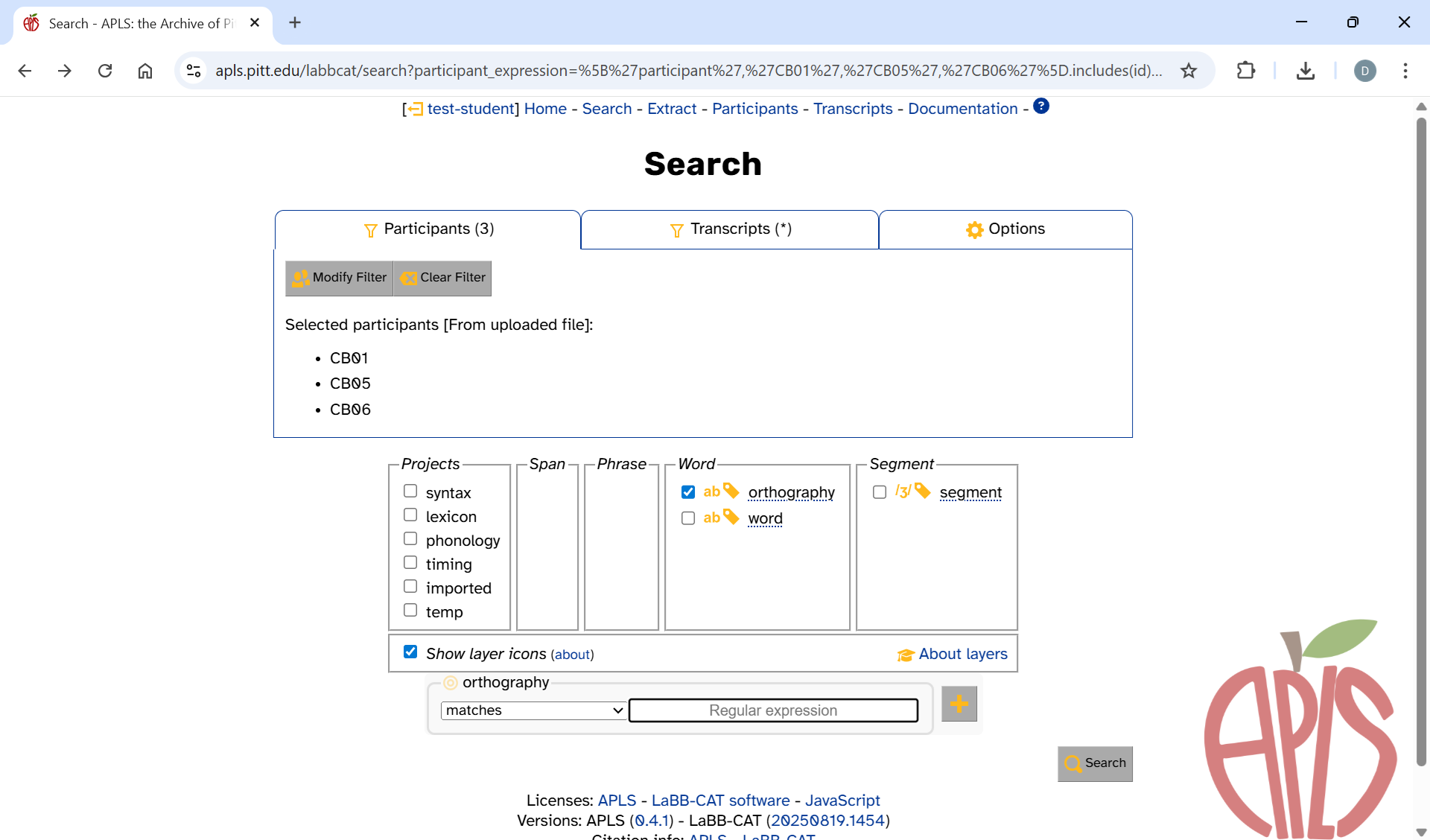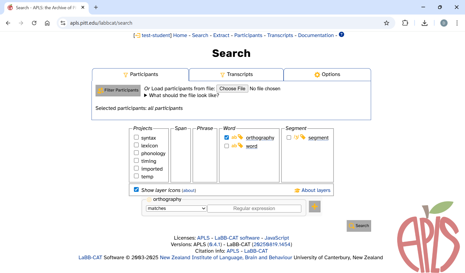 The Search page by default will conduct searches on all data in APLS. You can limit your search to a selection of participants and/or transcripts using the participants and transcripts filters.