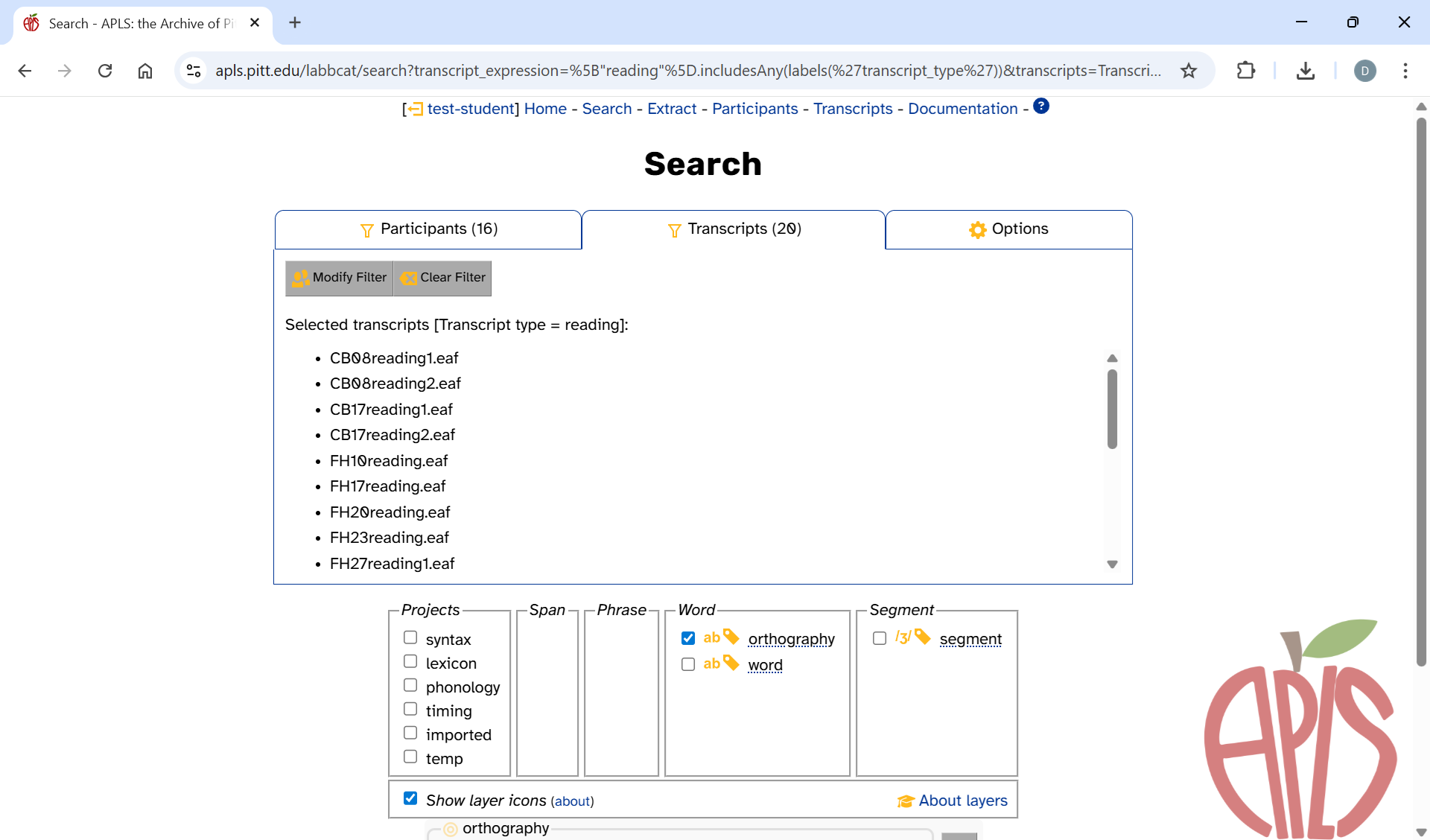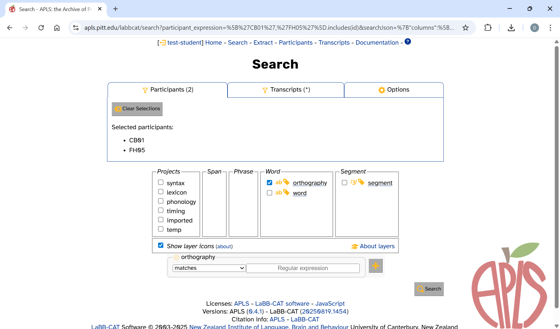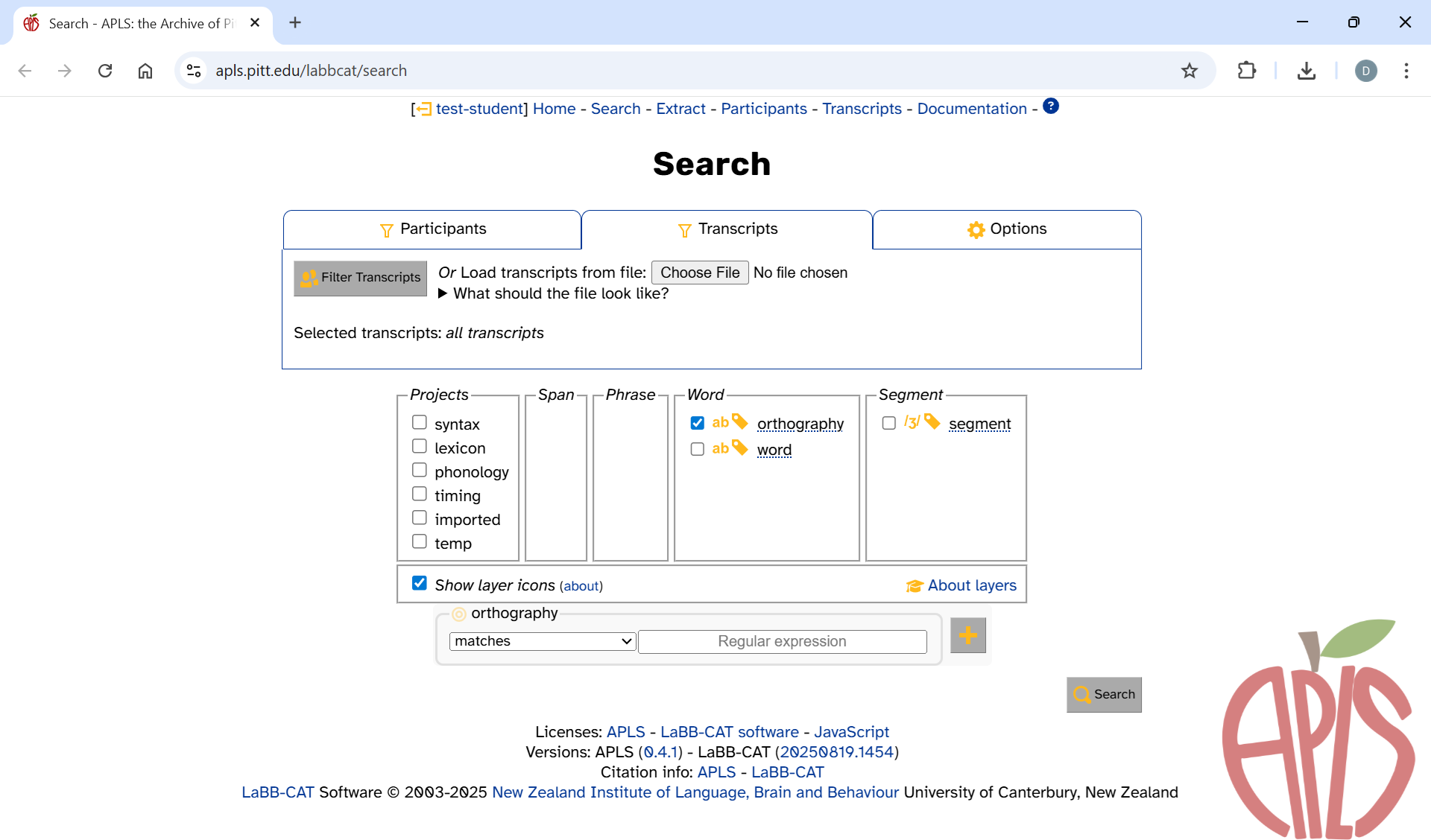 The Search page by default will conduct searches on all data in APLS. You can limit your search to a selection of participants and/or transcripts using the participants and transcripts filters.