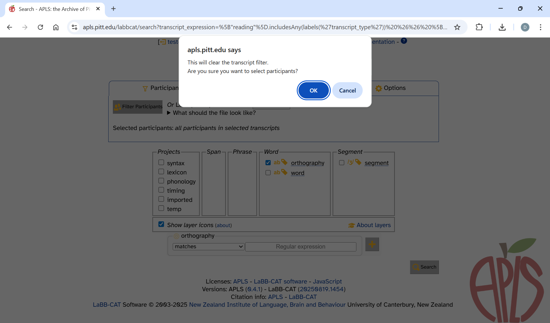 Due to technical limitations, you have to select the participant filter first if you want to filter both participants and transcripts. As a a result, selecting a participant filter after a transcript filter will overwrite the transcript filter. If you try to do that, APLS will warn you and give you the option to back out: