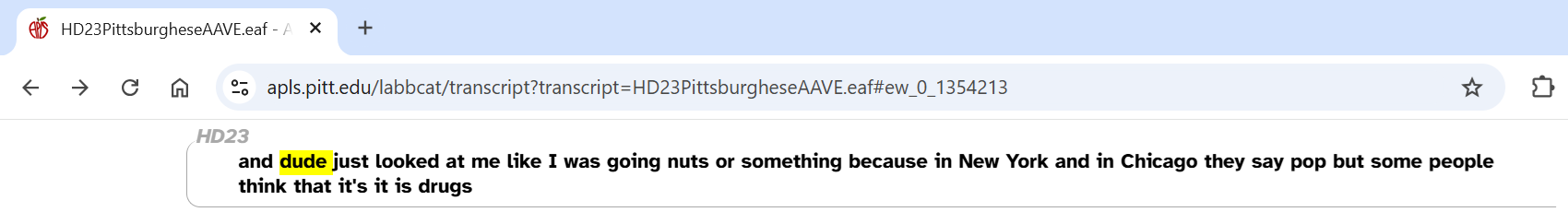 - The Transcripts page at https://apls.pitt.edu/labbcat/transcripts, as described on the Browsing transcripts documentation page.