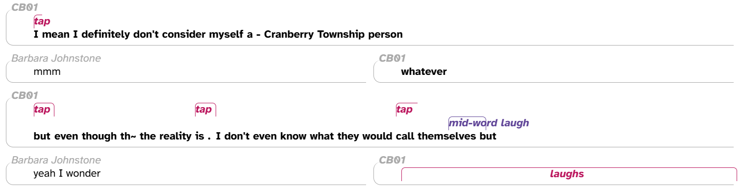 Every line in the transcript corresponds to a conversational turn or continuous utterance in the audio recording (see below) The participant who is speaking in a particular turn is shown in italic gray text above the turn. In the example above, the interviewer Barbara Johnstone is speaking in the first turn. If thereâs overlapping speech, participantsâ turns are shown side-by-side; this is the case in the second line above, where Barbara Johnstone and CB01 overlap one another. Bold text is used for CB01âs words and the CB01 speaker code, since CB01 is the main participant in this transcript (that is, the interviewee). Finally, the text in magenta italics represents noises, whether produced by a participant (e.g., breathing, smacking lips) or not (e.g., banging, car horns).